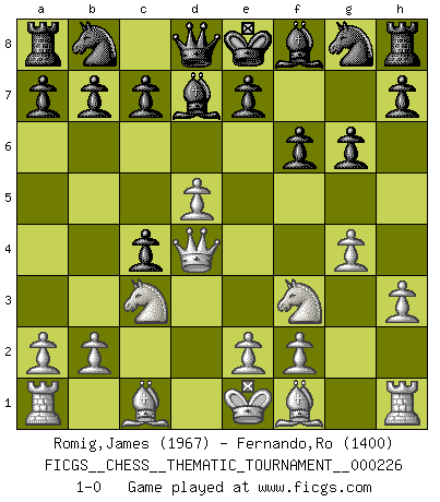 Last move : 1-0 2018 July 23 20:20:9 [Event "FICGS__CHESS__THEMATIC_TOURNAMENT__000226"] [Site "FICGS"] [Date "2018.06.13"] [Round "1"] [White "Romig,James"] [Black "Fernando,Ro"] [Result "1-0"] [WhiteElo "1967"] [BlackElo "1400"] 1.d4 d5 2.g4 Nc6 3.h3 g6 4.Nf3 Bd7 5.c4 dxc4 6.d5 Nb8 7.Qd4 f6 8.Nc3 1-0 This chess game has been lost on time (started : 2018.06.13 2:19:13) Queen's pawn game Player White won this chess game. Follow this game move after move (download)You need not play well - just help your opponent to play badly. (Genrikh Chepukaitis) Ich hatte meine größten Erfolge, als ich 47 Jahre alt war. Kasparow war noch nicht mal 42 und hat das Schach schon im Stich gelassen. (Viktor Kortschnoi) Bobby es la celebridad menos entendida y malinterpretada que camina el la faz de esta tierra. (Yasser Seirawan) Le génie consiste à savoir transgresser les règles au moment opportun. (Teichmann) Industry executives and analysts often mistakenly talk about strategy as if it were some kind of chess match. But in chess, you have just two opponents, each with identical resources, and with luck playing a minimal role. The real world is much more like a poker game, with multiple players trying to make the best of whatever hand fortune has dealt them. In our industry, Bill Gates owns the table until someone proves otherwise. (David Moschella, 'Computerworld')