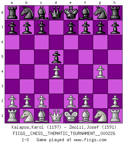 Last move : 1-0 2018 August 8 9:52:43 [Event "FICGS__CHESS__THEMATIC_TOURNAMENT__000226"] [Site "FICGS"] [Date "2018.06.13"] [Round "1"] [White "Kalapos,Karol"] [Black "Zmolil,Josef"] [Result "1-0"] [WhiteElo "1197"] [BlackElo "1591"] 1.d4 d5 2.g4 1-0 This chess game has been lost on time (started : 2018.06.13 2:19:13) Queen's pawn game Player White won this chess game. Follow this game move after move (download)The winner of the game is the player who makes the next-to-last mistake. (Savielly Tartakover) Ich las kürzlich ein Buch von Nietzsche. Er sagte Religion verdumme nur die Menschen. Ich stimme zu. (Robert James Fischer) Vive, pierde y aprende al observar a tu oponente como ganar. (Amber Steenbock) On n'a jamais que l'âge auquel on a commence à jouer aux échecs car après on cesse de vieillir. (Capablanca) Real knowledge is to know the extent of one's ignorance. (Confucius)