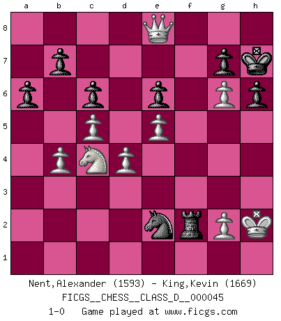 Last move : 1-0 2007 August 3 17:26:21 [Event "FICGS__CHESS__CLASS_D__000045"] [Site "FICGS"] [Date "2007.05.10"] [Round "1"] [White "Nent,Alexander"] [Black "King,Kevin"] [Result "1-0"] [WhiteElo "1593"] [BlackElo "1669"] 1.d4 Nf6 2.c4 e6 3.Nc3 Bb4 4.Qc2 O-O 5.a3 Bxc3+ 6.Qxc3 Ne4 7.Qc2 d5 8.e3 Nd7 9.Bd3 f5 10.Nh3 Nb6 11.c5 Nd7 12.O-O c6 13.f3 Nef6 14.b4 Qe8 15.Rb1 a6 16.Bd2 Kh8 17.Rbe1 h6 18.Bc3 Ng8 19.e4 fxe4 20.fxe4 Ndf6 21.e5 Ne4 22.Bxe4 dxe4 23.Rxf8 Qxf8 24.Nf2 Bd7 25.Nxe4 Be8 26.Rf1 Qe7 27.Nd6 Bh5 28.h3 Rb8 29.Bd2 Qh4 30.Rf4 Qg3 31.Rg4 Qxa3 32.Bc3 Rf8 33.Nc4 Qxc3 34.Qxc3 Bxg4 35.hxg4 Ne7 36.g5 Nd5 37.Qh3 Nf4 38.Qh4 Ne2+ 39.Kh2 Rf4 40.Qh5 Rf2 41.Qe8+ Kh7 42.g6+ 1-0 Nimzo-Indian : Classical variation Kingside Castling by player Black (move 4) Kingside Castling by player White (move 12) Player White won this chess game. Follow this game move after move (download)Place the contents of the Chess box in a hat, shake them up vigorously, pour them on the board from a height of two feet, and you get the style of Steinitz. (H. E. Bird) Wer der Ansicht ist, daß alle Schachspieler verrückt sind, wird durch Studium des Lebens von Emil Josef Diemer nicht auf andere Gedanken kommen. (Hans Ree) Buenas posiciones no logran ganar juegos, buenas movidas sí. (Gerald Abrahams) J'ai toujours senti une vague pitié pour l'homme qui ne connaît rien aux échecs, tout comme j'en aurais pour un homme ignorant de l'amour. Les Echecs, comme la musique ou comme l'amour, ont le pouvoir de rendre heureux. (Siegbert Tarrasch) Memory is a way of holding onto the things you love, the things you are, the things you never want to lose. (from the television show: The Wonder Years)