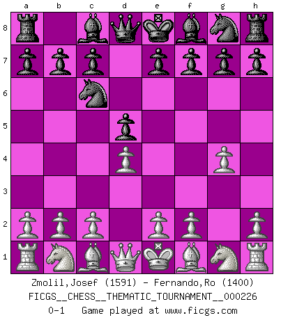 Last move : 0-1 2018 August 8 9:52:43 [Event "FICGS__CHESS__THEMATIC_TOURNAMENT__000226"] [Site "FICGS"] [Date "2018.06.13"] [Round "1"] [White "Zmolil,Josef"] [Black "Fernando,Ro"] [Result "0-1"] [WhiteElo "1591"] [BlackElo "1400"] 1.d4 d5 2.g4 Nc6 0-1 This chess game has been lost on time (started : 2018.06.13 2:19:13) Queen's pawn game Player Black won this chess game. Follow this game move after move (download)In Fischer's hands, a slight theoretical advantage is as good a being a Queen ahead. (Isaac Kashdan) Schach ist gnadenlos. Du mußt bereit sein zu töten. (Nigel Short) En la vida, como en el Ajedrez, los Peones propios obstruyen nuestro camino. La gran fortuna de un hombre, su comodidad, placer, hijos, libros, que deberían ayudarle a ganar, con mucha frecuencia lo ponen en Jaque Mate. (Charles Buxton) Même si l'adversaire joue le coup analysé précédemment, recommencez l'analyse en voyant la nouvelle position. Première règle de Blumenfeld A good programmer is someone who always looks both ways before crossing a one-way street. (Doug Linder)