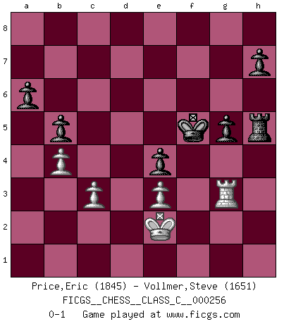 Last move : 0-1 2018 September 5 22:14:6 [Event "FICGS__CHESS__CLASS_C__000256"] [Site "FICGS"] [Date "2018.06.13"] [Round "1"] [White "Price,Eric"] [Black "Vollmer,Steve"] [Result "0-1"] [WhiteElo "1845"] [BlackElo "1651"] 1.e4 e5 2.Nf3 Nc6 3.Bb5 a6 4.Ba4 Nf6 5.O-O b5 6.Bb3 Be7 7.d4 Nxe4 8.dxe5 Nc5 9.Nc3 Nxb3 10.axb3 O-O 11.Bf4 Bb7 12.Nd5 Rc8 13.Nxe7+ Qxe7 14.c3 Nd8 15.Bg5 Qe6 16.Re1 Qg6 17.Bxd8 Rcxd8 18.Re3 d6 19.Qd4 c5 20.Qf4 Bxf3 21.Rxf3 dxe5 22.Qg3 Qxg3 23.Rxg3 Rd2 24.h4 Ra8 25.Ra2 f6 26.h5 Kf7 27.Re3 Rd6 28.b4 c4 29.g4 g6 30.Rh3 g5 31.b3 cxb3 32.Rb2 Re8 33.Rxb3 e4 34.Re3 Rd3 35.Ra3 Rxe3 36.fxe3 Re6 37.Kf2 Rd6 38.Ke2 f5 39.Ra1 fxg4 40.Rg1 Kf6 41.Rf1+ Ke5 42.Rf8 g3 43.Rf1 Rh6 44.Rg1 Rxh5 45.Rxg3 Kf5 0-1 Ruy Lopez : 5.O-O Kingside Castling by player White (move 5) Kingside Castling by player Black (move 10) Player Black won this chess game. Follow this game move after move (download)By this measure (on the gap between Fischer & his contemporaries), I consider him the greatest world champion. (Garry Kasparov) Ein Remis kann durch Wiederholung von drei Zügen oder durch einen schlechte Zug erreicht werden. (Savielly Grigorievitsch Tartakower) El estómago es una parte esencial del maestro de Ajedrez. (Bent Larsen) Il vaut mieux sacrifier les pièces de l'adversaire. (Xavier Tartacover) It's only after you lost everything, Tyler says, that you're free to do anything. (Chuck Palahniuk, Fight Club)