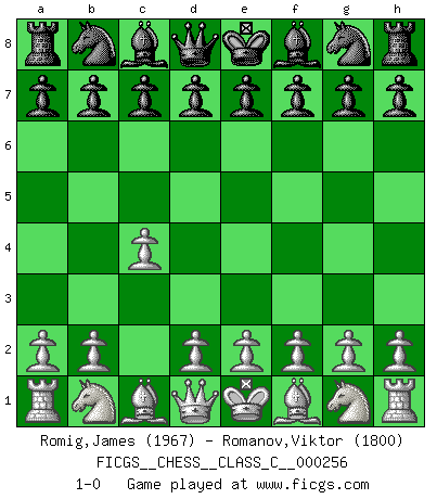 Last move : 1-0 2018 July 23 20:20:9 [Event "FICGS__CHESS__CLASS_C__000256"] [Site "FICGS"] [Date "2018.06.13"] [Round "1"] [White "Romig,James"] [Black "Romanov,Viktor"] [Result "1-0"] [WhiteElo "1967"] [BlackElo "1800"] 1.c4 1-0 This chess game has been lost on time (started : 2018.06.13 10:28:20) English Opening Player White won this chess game. Follow this game move after move (download)Is Bobby Fischer quite sane ? (Salo Flohr) Wenn Schach ein enormer Dschungel ist, der seine Myriaden von Geheimnissen nicht preisgeben will, dann sind Computer die Kettensägen einer gewaltigen ökologisch unsensiblen Nutzholzfirma. (Nigel Short) Durante una competencia de Ajedrez, un Maestro de Ajedrez deberá ser una combinación de presa de caza y un Monge. (Alexander Alekhine) Mon pion favori sur ma case favorite ! Bronstein en parlant d'un coup de pion en h5 quand il avait les Noirs. When I took office, only high energy physicists had ever heard of what is called the World Wide Web... Now even my cat has its own page. (Bill Clinton, 1996)