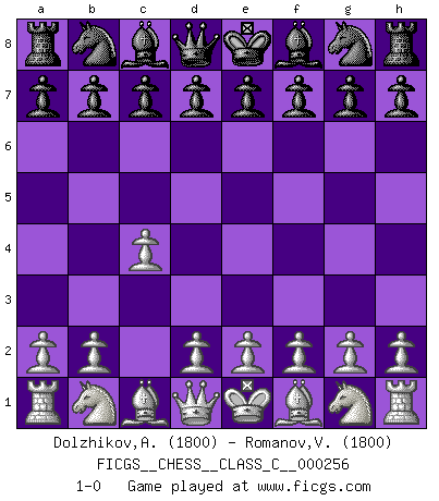 Last move : 1-0 2018 July 23 20:20:9 [Event "FICGS__CHESS__CLASS_C__000256"] [Site "FICGS"] [Date "2018.06.13"] [Round "1"] [White "Dolzhikov,Aleksandr"] [Black "Romanov,Viktor"] [Result "1-0"] [WhiteElo "1800"] [BlackElo "1800"] 1.c4 1-0 This chess game has been lost on time (started : 2018.06.13 10:28:20) English Opening Player White won this chess game. Follow this game move after move (download)One bad move nullifies forty good ones. (Horowitz) Der beste Spieler in einem Turnier gewinnt es nie. Er landet auf Platz zwei oder drei. (Siegbert Tarrasch) El Ajedrez es parte de una cultura y si una cultura esta en decadencia, entonces también el Ajedrez declinará. (Mikhail Botvinnik) J'ai toujours senti une vague pitié pour l'homme qui ne connaît rien aux échecs, tout comme j'en aurais pour un homme ignorant de l'amour. Les Echecs, comme la musique ou comme l'amour, ont le pouvoir de rendre heureux. (Siegbert Tarrasch) Life is like a game of cards: the hand you are dealt represents determinism; the way you play it is free will. (Jawaharlal Nehru)