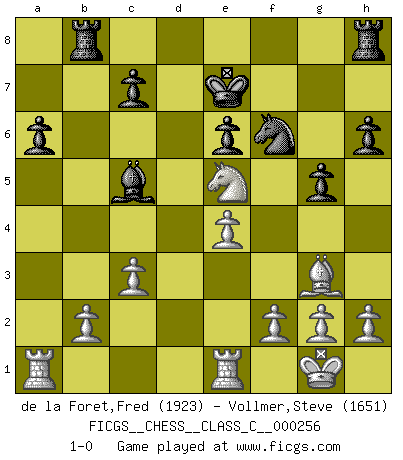 Last move : 1-0 2018 July 4 12:31:32 [Event "FICGS__CHESS__CLASS_C__000256"] [Site "FICGS"] [Date "2018.06.13"] [Round "1"] [White "de la Foret,Fred"] [Black "Vollmer,Steve"] [Result "1-0"] [WhiteElo "1923"] [BlackElo "1651"] 1.e4 e5 2.Nf3 Nc6 3.Bb5 a6 4.Ba4 b5 5.Bb3 Nf6 6.O-O Bc5 7.c3 d6 8.d4 Bb6 9.a4 Rb8 10.Na3 bxa4 11.Bxa4 Bd7 12.dxe5 Nxe5 13.Nxe5 dxe5 14.Bg5 Bxa4 15.Qxa4+ Qd7 16.Qc4 Qe6 17.Qxe6+ fxe6 18.Rfe1 h6 19.Bh4 Bc5 20.Nc4 g5 21.Bg3 Ke7 22.Nxe5 1-0 Ruy Lopez : Caro variation Kingside Castling by player White (move 6) Player White won this chess game. Follow this game move after move (download)Bobby Fischer is the greatest Chess genius of all time ! (Alexander Kotov) Karpov ist ein Museumsstück. (Garry Kasparov) El hombre es un frívolo, una creatura engañosa y como un jugador de Ajedrez, se preocupa mas por el proceso de obtener su meta que de la meta por sí misma. (Dostoyevsky) Les Echecs, c'est l'art de la guerre sans les charniers, c'est la résurrection des morts tombés au champ d'honneur, l'espoir perpétuel, la suprématie de l'intelligence sur la force, la culture de l'esprit. (F. Szpiner) The next best thing to gambling and winning is gambling and loosing. (Nick Dandalos)