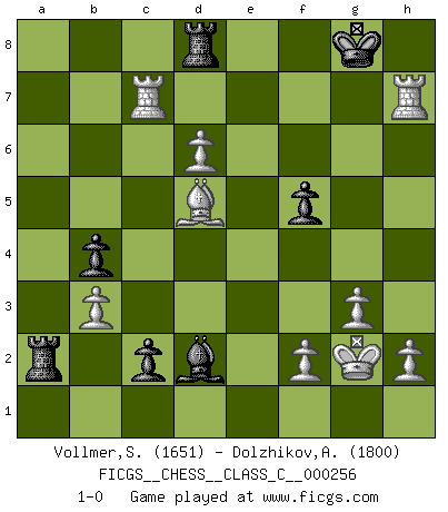 Last move : 1-0 2018 August 3 18:29:34 [Event "FICGS__CHESS__CLASS_C__000256"] [Site "FICGS"] [Date "2018.06.13"] [Round "1"] [White "Vollmer,Steve"] [Black "Dolzhikov,Aleksandr"] [Result "1-0"] [WhiteElo "1651"] [BlackElo "1800"] 1.d4 d5 2.c4 c6 3.Nf3 Nf6 4.Nc3 e6 5.Bg5 dxc4 6.e3 b5 7.a4 Bb4 8.axb5 cxb5 9.Be2 O-O 10.O-O Qb6 11.Bxf6 gxf6 12.Ne4 Nd7 13.Qc2 Bb7 14.Ng3 Rac8 15.e4 Kh8 16.Rfd1 Rfd8 17.Qc1 Bxe4 18.Nxe4 a5 19.Qh6 Be7 20.Nh4 Rg8 21.Bh5 f5 22.Nc5 Bg5 23.Nxd7 Qd8 24.Ne5 Rc7 25.Nxf7+ Rxf7 26.Qxe6 Rf6 27.Qe2 Bxh4 28.Qd2 Qd5 29.Bf3 Qd8 30.Qxa5 Qxa5 31.Rxa5 Rb6 32.d5 Rd8 33.Ra7 b4 34.Rc7 c3 35.b3 Ra6 36.g3 Bg5 37.Re1 Bd2 38.R1e7 Ra1+ 39.Kg2 Ra2 40.d6 c2 41.Rxh7+ Kg8 42.Bd5+ 1-0 QGD Slav : 4.Nc3 Kingside Castling by player Black (move 9) Kingside Castling by player White (move 10) Player White won this chess game. Follow this game move after move (download)It is always better to sacrifice your opponent's men. (Savielly Tartakower) Meine Liebe ist Schach, Schach, Schach. Ich muss jeden Tag Schach spielen, deshalb fühle ich mich so stark. (Miguel Najdorf) Yo creo que el Ajedrez posee una magia que es también una ayuda en la edad avanzada. Una rodilla reumática es olvidada durante una partida de Ajedrez y otros eventos pueden parecer algo sin importancia comparada a una catástrofe en el tablero de Ajedrez. (Vlastimil Hort) On n'a jamais que l'âge auquel on a commence à jouer aux échecs car après on cesse de vieillir. (Capablanca) Nowadays, anyone who cannot speak English and is incapable of using the Internet is regarded as backward. (Al-Waleed bin Talal)