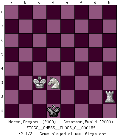 Last move : 1/2-1/2 2018 July 20 16:44:27 [Event "FICGS__CHESS__CLASS_A__000189"] [Site "FICGS"] [Date "2018.06.13"] [Round "1"] [White "Maron,Gregory"] [Black "Gossmann,Ewald"] [Result "1/2-1/2"] [WhiteElo "2000"] [BlackElo "2000"] 1.d4 Nf6 2.c4 e6 3.Nc3 Bb4 4.Qc2 O-O 5.a3 Bxc3+ 6.Qxc3 b6 7.Nf3 Bb7 8.e3 d5 9.b4 Nbd7 10.Bb2 a5 11.b5 Rc8 12.cxd5 Bxd5 13.Bd3 c5 14.bxc6 Bxc6 15.Qb3 Bd5 16.Qd1 Rc7 17.O-O Qa8 18.Re1 Be4 19.Bf1 Rfc8 20.Nd2 Bc2 21.Qe2 Bg6 22.f3 Rc2 23.Rab1 Nd5 24.e4 Nc3 25.Bxc3 R8xc3 26.Qb5 Qc8 27.Rbd1 h6 28.Nb1 Rc7 29.a4 Qf8 30.Nd2 Ra2 31.Nc4 Qb4 32.Qxb4 axb4 33.Ra1 Rxa1 34.Rxa1 f5 35.e5 f4 36.Ra2 Ra7 37.Nd6 b3 38.Rb2 Rxa4 39.Bc4 Nf8 40.Rxb3 Ra1+ 41.Kf2 Ra2+ 42.Ke1 Ra1+ 43.Kd2 Ra2+ 44.Kc1 Rc2+ 45.Kd1 Rxg2 46.Rxb6 Bh5 47.Rb3 Rxh2 48.d5 exd5 49.Bxd5+ Kh7 50.Rb8 Nd7 51.Be4+ Bg6 52.e6 Nf6 53.Bxg6+ Kxg6 54.e7 Rh1+ 55.Ke2 Rh2+ 56.Kf1 Rh1+ 57.Kg2 Re1 58.e8Q+ Nxe8 59.Nxe8 Re6 60.Nc7 Rd6 61.Kh3 Kh5 62.Ne8 Rd3 63.Nxg7+ Kg6 64.Ne6 Rxf3+ 65.Kg4 Rg3+ 66.Kxf4 Ra3 67.Rb6 Ra4+ 68.Kf3 Ra3+ 69.Kg4 h5+ 70.Kh4 Ra4+ 71.Nd4 Kg7 72.Rd6 Kf7 73.Kxh5 Ra5+ 74.Kg4 Ke7 75.Re6+ Kd7 76.Kf4 Rd5 77.Re4 Kd6 78.Nf5+ Kc5 79.Re8 Rd7 80.Ke4 Rd1 81.Rc8+ Kb4 82.Ne3 Rh1 83.Kd4 Rh3 84.Rb8+ Ka3 85.Nc2+ Ka2 86.Nb4+ Kb3 87.Nd3 Kc2 88.Rb2+ Kd1 89.Kc3 Rh2 90.Rxh2 1/2-1/2 Nimzo-Indian : Classical variation Kingside Castling by player Black (move 4) Kingside Castling by player White (move 17) Promotion Queen by player White (move 58) 10 pieces endgame at move 58 : White KRNP , Black KRNPPP WHITE : King + 1 Rook 1 Knight 1 Pawn BLACK : King + 1 Rook 1 Knight 3 Pawns 9 pieces endgame at move 59 : White KRNP , Black KRPPP WHITE : King + 1 Rook 1 Knight 1 Pawn BLACK : King + 1 Rook 3 Pawns 8 pieces endgame at move 63 : White KRNP , Black KRPP WHITE : King + 1 Rook 1 Knight 1 Pawn BLACK : King + 1 Rook 2 Pawns 7 pieces endgame at move 64 : White KRN , Black KRPP WHITE : King + 1 Rook 1 Knight BLACK : King + 1 Rook 2 Pawns 6 pieces endgame at move 66 : White KRN , Black KRP WHITE : King + 1 Rook 1 Knight BLACK : King + 1 Rook 1 Pawn 5 pieces endgame at move 73 : White KRN , Black KR WHITE : King + 1 Rook 1 Knight BLACK : King + 1 Rook 4 pieces endgame at move 90 : White KRN , Black K WHITE : King + 1 Rook 1 Knight BLACK : King + This chess game ended in a draw. Follow this game move after move (download)After black's reply to 1.e4 with 1..e5, leaves him always trying to get into the game. (Howard Staunton) Vom Schach wurde gesagt das Leben sei dafür nicht lange genug. Aber das ist der Fehler des Lebens, nicht des Schach'. (Irving Chernev) Durante una competencia de Ajedrez, un Maestro de Ajedrez deberá ser una combinación de presa de caza y un Monge. (Alexander Alekhine) La menace est plus forte que l'exécution. (Aaron Nimzovitch) Humor is by far the most significant activity of the human brain. (Edward De Bono)