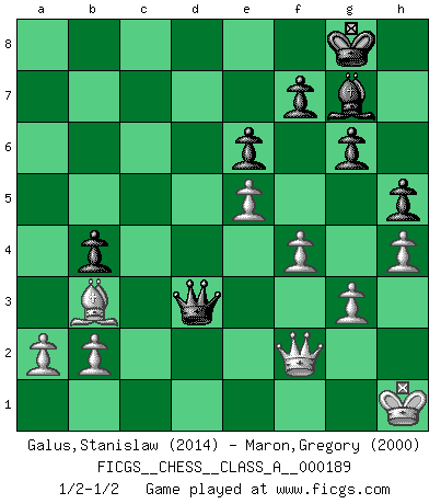 Last move : 1/2-1/2 2018 July 4 12:3:33 [Event "FICGS__CHESS__CLASS_A__000189"] [Site "FICGS"] [Date "2018.06.13"] [Round "1"] [White "Galus,Stanislaw"] [Black "Maron,Gregory"] [Result "1/2-1/2"] [WhiteElo "2014"] [BlackElo "2000"] 1.d4 Nf6 2.c4 e6 3.Nf3 d5 4.Nc3 Bb4 5.Bg5 dxc4 6.e4 h6 7.Bxf6 Qxf6 8.Bxc4 c5 9.O-O cxd4 10.Nb5 Qe7 11.Qxd4 O-O 12.Nxa7 Bc5 13.Nxc8 Rxc8 14.Qd3 Nc6 15.Qe2 Nd4 16.Nxd4 Bxd4 17.Rab1 g6 18.g3 b5 19.Bb3 b4 20.Qd2 Bg7 21.f4 Rd8 22.Qe2 Rd4 23.Rbc1 h5 24.h4 Rad8 25.Rc2 R8d7 26.Qg2 Qd8 27.Kh1 Rd2 28.Rxd2 Rxd2 29.Rf2 Rxf2 30.Qxf2 Qd3 31.e5 1/2-1/2 Queen's pawn game Kingside Castling by player White (move 9) Kingside Castling by player Black (move 11) This chess game ended in a draw. Follow this game move after move (download)Man is a frivolous, a specious creature, and like a Chess player, cares more for the process of attaining his goal than for the goal itself. (Dostoyevsky) Ich trinke, ich rauche, ich spiele, ich liebe Frauen – aber Fernschach ist ein Laster, das ich nicht habe. (Mikhail Nekhemyevich Tal) Ser exitoso en el Ajedrez te permite descubrir tu propia personalidad. Eso es lo que deseo para los niños de mi clase. (Saudin Robovic) Il vaut mieux sacrifier les pièces de l'adversaire. (Xavier Tartacover) Empty your mind, be formless, shapeless — like water. (Bruce Lee)