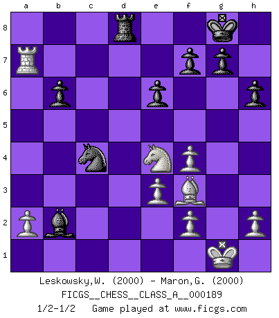 Last move : 1/2-1/2 2018 August 10 8:26:18 [Event "FICGS__CHESS__CLASS_A__000189"] [Site "FICGS"] [Date "2018.06.13"] [Round "1"] [White "Leskowsky,Wandrille"] [Black "Maron,Gregory"] [Result "1/2-1/2"] [WhiteElo "2000"] [BlackElo "2000"] 1.c4 Nf6 2.Nc3 c5 3.g3 e6 4.Nf3 b6 5.Bg2 Bb7 6.O-O Be7 7.d4 cxd4 8.Qxd4 O-O 9.Rd1 d6 10.Bg5 Nc6 11.Qf4 Qb8 12.Bxf6 Bxf6 13.Rxd6 Na5 14.Rad1 Qc7 15.Rd7 Qxf4 16.gxf4 Bc6 17.Ng5 Bxd7 18.Bxa8 Bxc3 19.Rxd7 Bxb2 20.Rxa7 Nxc4 21.Bf3 h6 22.Ne4 Rd8 23.e3 1/2-1/2 English Opening Kingside Castling by player White (move 6) Kingside Castling by player Black (move 8) This chess game ended in a draw. Follow this game move after move (download)You know you're going to lose. Even when I was ahead I knew I was going to lose. - On playing against Fischer. (Andrew Soltis) Karpov ist ein Museumsstück. (Garry Kasparov) El tablero es el mundo, las piezas es el fenomeno del universo, las reglas del juego son lo que llamamos leyes de la naturaleza y el jugador del lado opuesto, se encuentra oculto a nuestra vista. (Thomas Huxley) Echiquier : carré parfait, comme la Jérusalem nouvelle décrite par l'auteur de l'Apocalypse, huit cases sur huit, exaltation du chiffre 4, symbole du cosmos aux quatre horizons... où le noir et le blanc, l'ombre et la lumière, le mal et le bien s'entremêlent et se conjuguent. (Robert Couffignal, Le Gambit du poète) If things go wrong, don't go with them. (Roger Babson)