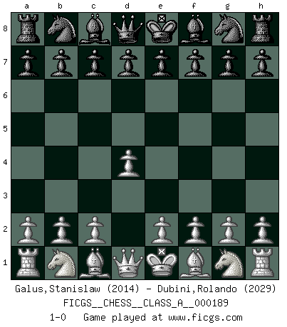 Last move : 1-0 2018 July 24 20:29:16 [Event "FICGS__CHESS__CLASS_A__000189"] [Site "FICGS"] [Date "2018.06.13"] [Round "1"] [White "Galus,Stanislaw"] [Black "Dubini,Rolando"] [Result "1-0"] [WhiteElo "2014"] [BlackElo "2029"] 1.d4 1-0 This chess game has been lost on time (started : 2018.06.13 22:24:45) Queen's pawn Player White won this chess game. Follow this game move after move (download)Chess, like love, like music, has the power to make people happy. (Siegbert Tarrasch) Die Leute spielen gegen mich seit 15 Jahren unter Ihren Möglichkeiten. (Robert James Fischer) Fischer es el jugador mas fuerte del mundo. De hecho, el jugador mas fuerte que jamas haya existido. (Larry Evans) J'ai toujours senti une vague pitié pour l'homme qui ne connaît rien aux échecs, tout comme j'en aurais pour un homme ignorant de l'amour. Les Echecs, comme la musique ou comme l'amour, ont le pouvoir de rendre heureux. (Siegbert Tarrasch) Live, lose, and learn, by observing your opponent how to win. (Amber Steenbock)