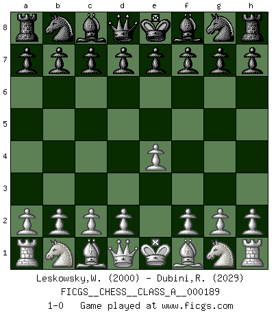 Last move : 1-0 2018 July 25 8:31:54 [Event "FICGS__CHESS__CLASS_A__000189"] [Site "FICGS"] [Date "2018.06.13"] [Round "1"] [White "Leskowsky,Wandrille"] [Black "Dubini,Rolando"] [Result "1-0"] [WhiteElo "2000"] [BlackElo "2029"] 1.e4 1-0 This chess game has been lost on time (started : 2018.06.13 22:24:45) King's pawn Opening Player White won this chess game. Follow this game move after move (download)You are for me the Queen on d8 and I am the Pawn on d7 !! (Eduard Gufeld) Es hat in meinem Leben Zeiten gegeben, in denen das Schachspiel, wenn nicht zum Lebenszweck, so doch zu einem regelrechten Lebensersatz geworden ist. Man fühlt sich in solchen Zeiten nicht so, als besäße man eine göttliche Gabe, sondern eher so, als sei man von ihr besessen. (Garry Kasparov) EL Ajedrez es como la vida. (Boris Spassky) Karpov est une pièce de musée. (Garry Kasparov) The only sure thing about luck is that it will change. (Wilson Mizner)