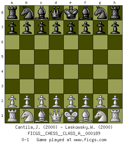 Last move : 0-1 2018 July 24 8:29:48 [Event "FICGS__CHESS__CLASS_A__000189"] [Site "FICGS"] [Date "2018.06.13"] [Round "1"] [White "Cantila,Jerry"] [Black "Leskowsky,Wandrille"] [Result "0-1"] [WhiteElo "2000"] [BlackElo "2000"] 0-1 This chess game has been lost on time (started : 2018.06.13 22:24:45) Player Black won this chess game. Follow this game move after move (download)Chess is a matter of delicate judgment, knowing when to punch and how to duck. (Bobby Fischer) Nie in meinem Leben habe ich die französische Verteidigung gespielt, welche die Stumpfsinnigste von allen ist. (Wilhelm Steinitz) El Ajedrez es un juego terrible. Si no dominas el centro, tu oponente tiene una posición mas libre. Si tu tienes el centro, entonces realmente tienes algo de que preocuparte. (Siegbert Tarrasch) Le jeu d'échecs fait naître et fortifie en nous plusieurs qualités précieuses dans le cours de l'existence, telles que la prévoyance, la circonspection, la prudence, et la persévérance. (Benjamin Franklin - 1783, la morale des échecs) Excelling at chess has long been considered a symbol of more general intelligence. That is an incorrect assumption in my view, as pleasant as it might be. But for the purposes of argument and investigation, chess is, in Russkin-Gutman's words, 'an unparalleled laboratory, since both the learning process and the degree of ability obtained can be objectified and quantified, providing an excellent comparative framework on which to use rigorous analytical techniques.' (The Chess Master and the Computer, by Garry Kasparov - 2010)