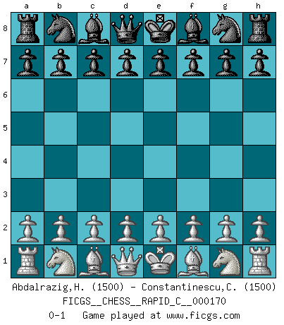 Last move : 0-1 2018 July 14 19:34:23 [Event "FICGS__CHESS__RAPID_C__000170"] [Site "FICGS"] [Date "2018.06.14"] [Round "1"] [White "Abdalrazig,Hosam"] [Black "Constantinescu,Costin"] [Result "0-1"] [WhiteElo "1500"] [BlackElo "1500"] 0-1 This chess game has been lost on time (started : 2018.06.14 17:28:27) Player Black won this chess game. Follow this game move after move (download)Chess is imagination. (David Bronstein) Fischer: 'Remis!?' Uhlmann: 'Aber es muss doch dreimal Zugwiederholung sein!' Fischer: 'Sie nehmen das Remis an, wie ich es sage, sonst spiele ich weiter und werde Sie dann schlagen!' (Robert James Fischer) Uno por uno, yo los acribillé, mi superioridad muy pronto se volvio aparente. (Jose Capablanca) Avant la finale, les dieux ont créé le milieu de partie. (Tarrasch) I find television to be very educating. Every time somebody turns on the set, I go in the other room and read a book. (Groucho Marx)