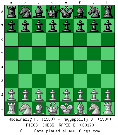 Last move : 0-1 2018 July 14 19:34:23 [Event "FICGS__CHESS__RAPID_C__000170"] [Site "FICGS"] [Date "2018.06.14"] [Round "1"] [White "Abdalrazig,Hosam"] [Black "Payyappilly,Sreekumay"] [Result "0-1"] [WhiteElo "1500"] [BlackElo "1500"] 0-1 This chess game has been lost on time (started : 2018.06.14 17:28:27) Player Black won this chess game. Follow this game move after move (download)In a gambit you give up a Pawn for the sake of getting a lost game. (Samuel Standige Boden) Modernes Schach sorgt sich zuviel um Dinge wie Bauernstruktur usw. Vergessen Sie das, Schachmatt beendet das Spiel! (Nigel Short) Tu eres para mi la Reina en d8 y yo soy el Peón en d7!!. (GM Eduard Gufeld) Le temps de noter son nom sur la feuille de partie, j'étais déjà en zeitnot ! D'un modeste amateur apparié lors de la première ronde d'un open contre le grand-maître Azmaïparashvili. Without deviation from the norm, progress is not possible. (Frank Zappa)