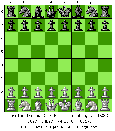 Last move : 0-1 2018 July 14 19:34:23 [Event "FICGS__CHESS__RAPID_C__000170"] [Site "FICGS"] [Date "2018.06.14"] [Round "1"] [White "Constantinescu,Costin"] [Black "Tasabih,Tasabih"] [Result "0-1"] [WhiteElo "1500"] [BlackElo "1500"] 0-1 This chess game has been lost on time (started : 2018.06.14 17:28:27) Player Black won this chess game. Follow this game move after move (download)Methodical thinking is of more use in Chess than inspiration. (C. J. S. Purdy) Schach ist Kampf, hauptsächlich jedoch gegen die eigenen Fehler. (Savielly Grigorievitsch Tartakower) Yo jugué Ajedrez con el y a veces le pude haber ganado solo que siempre devuelve su última jugada y juega la partida de manera diferente. (Mark Twain) Vouloir jouer aux échecs contre soi-même est aussi paradoxal que vouloir marcher sur son ombre. (Stefan Zweig) Always remember that you are unique; just like everyone else. (Unknown)