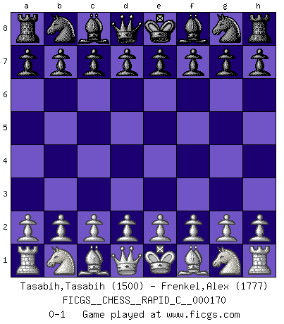 Last move : 0-1 2018 July 14 19:34:23 [Event "FICGS__CHESS__RAPID_C__000170"] [Site "FICGS"] [Date "2018.06.14"] [Round "1"] [White "Tasabih,Tasabih"] [Black "Frenkel,Alex"] [Result "0-1"] [WhiteElo "1500"] [BlackElo "1777"] 0-1 This chess game has been lost on time (started : 2018.06.14 17:28:27) Player Black won this chess game. Follow this game move after move (download)Your body has to be in top condition. Your Chess deteriorates as your body does. You can't separate body from mind. (Bobby Fischer) Mit Schach schule ich mein Gefühl für Geometrie, was für Tennis und Schach gleichermaßen wichtig ist. (Boris Becker) Los libros de Ajedrez deben de usarse igual como usamos los anteojos: para mejorar la vista, aunque algunos jugadores los quieren usar como si ellos les otorgaran la vision. (José Raúl Capablanca) Votre prénom est 'Tactique', votre deuxième prénom est 'Tactique' et votre nom est 'Tactique'. (Ken Smith) You can think I'm wrong, but that's no reason to quit thinking. (Gregory House, House M.D.)