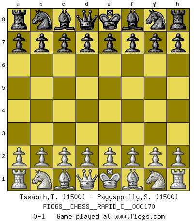 Last move : 0-1 2018 July 14 19:34:23 [Event "FICGS__CHESS__RAPID_C__000170"] [Site "FICGS"] [Date "2018.06.14"] [Round "1"] [White "Tasabih,Tasabih"] [Black "Payyappilly,Sreekumay"] [Result "0-1"] [WhiteElo "1500"] [BlackElo "1500"] 0-1 This chess game has been lost on time (started : 2018.06.14 17:28:27) Player Black won this chess game. Follow this game move after move (download)Robert Fischer is a law unto himself. (Larry Evans) Im Spitzenschach von heute geht es nur um Vorbereitung, um tiefgründige, sorgfältige Eröffnungsvorbereitung. (Nigel Short) El Ajedrez, como cualquier actividad creativa, solo puede existir a través del esfuerzo combinado de aquellos que tienen talento creativo y de aquellos que poseen la habilidad de organizar su trabajo creativo. (Mikhail Botvinnik) La victoire dans une partie d'Echecs appartient la plupart du temps à celui qui voit un peu plus loin que l'adversaire. (Lasker) Go and wake up your luck. (Persian saying)