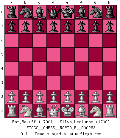 Last move : 0-1 2018 July 15 7:35:37 [Event "FICGS__CHESS__RAPID_B__000283"] [Site "FICGS"] [Date "2018.06.14"] [Round "1"] [White "Ram,Bekuff"] [Black "Silva,Leoturbo"] [Result "0-1"] [WhiteElo "1700"] [BlackElo "1700"] 0-1 This chess game has been lost on time (started : 2018.06.14 22:17:3) Player Black won this chess game. Follow this game move after move (download)A bad day of Chess is better than any good day at work. (Anonymous) Frage des Reporters: -Worin besteht das Ziel von Gambiteröffnungen? Antwort: -Auf Kosten der Partie einen Ruf als Angriffspieler zu erwerben.- (Siegbert Tarrasch) Los errores estan ahí, esperando a que se cometan. (Savielly Tartakower) La guerre est enfant de la passion, la passion est enfant du narcissisme et le narcissisme est l'enfant. (...) Une autre partie ? (Thibault de Vassal) It's unlucky to be superstitious. (Dave Enteles)