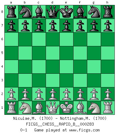 Last move : 0-1 2018 July 15 7:35:37 [Event "FICGS__CHESS__RAPID_B__000283"] [Site "FICGS"] [Date "2018.06.14"] [Round "1"] [White "Niculae,Marin"] [Black "Nottingham,Matthew"] [Result "0-1"] [WhiteElo "1700"] [BlackElo "1700"] 0-1 This chess game has been lost on time (started : 2018.06.14 22:17:3) Player Black won this chess game. Follow this game move after move (download)It is the aim of the modern school, not to treat every position according to one general law, but according to the principle inherent in the position. (Richard Reti) Im Leben werden Partien nie so unstrittig gewonnen wie im Spiel (Emanuel Lasker) Por esta medida (el intervalo entre Fischer y sus contemporaneos), yo le considero el mas grande campeón mundial. (Garry Kasparov) L'ordinateur a tué l'originalité. Il n'y a plus guère d'aventures sur l'échiquier. (Jacob Murray) When you stop learning you start dying. (Scott Adams)