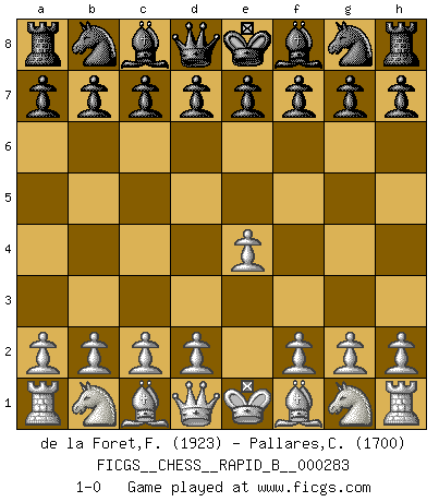 Last move : 1-0 2018 July 15 7:35:37 [Event "FICGS__CHESS__RAPID_B__000283"] [Site "FICGS"] [Date "2018.06.14"] [Round "1"] [White "de la Foret,Fred"] [Black "Pallares,Carmen"] [Result "1-0"] [WhiteElo "1923"] [BlackElo "1700"] 1.e4 1-0 This chess game has been lost on time (started : 2018.06.14 22:17:3) King's pawn Opening Player White won this chess game. Follow this game move after move (download)One bad move nullifies forty good ones. (Horowitz) Wer der Ansicht ist, daß alle Schachspieler verrückt sind, wird durch Studium des Lebens von Emil Josef Diemer nicht auf andere Gedanken kommen. (Hans Ree) Buenas posiciones no logran ganar juegos, buenas movidas sí. (Gerald Abrahams) On entre au jeu d'Echecs comme on entre en Religion. Pour le joueur d'Echecs, la partie d'Echecs c'est l'office, la messe, le défilé du 1er Mai, le dépôt de gerbe au Monument aux Morts. C'est un drame sacré. (Michel Roos) The existence of forgetting has never been proved: We only know that some things don't come to mind when we want them. (Friedrich Nietzsche)