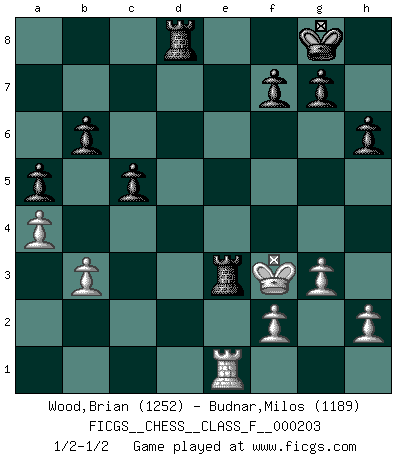 Last move : 1/2-1/2 2018 October 28 3:33:2 [Event "FICGS__CHESS__CLASS_F__000203"] [Site "FICGS"] [Date "2018.06.15"] [Round "1"] [White "Wood,Brian"] [Black "Budnar,Milos"] [Result "1/2-1/2"] [WhiteElo "1252"] [BlackElo "1189"] 1.d4 Nf6 2.c4 e6 3.Nf3 b6 4.g3 Bb4+ 5.Bd2 Bxd2+ 6.Nbxd2 Bb7 7.Bg2 Bxf3 8.Bxf3 Nc6 9.e4 Nxd4 10.O-O Nxf3+ 11.Qxf3 O-O 12.Rfe1 d5 13.exd5 exd5 14.cxd5 Qxd5 15.Qxd5 Nxd5 16.Nf3 h6 17.Rac1 c5 18.Ne5 Rfd8 19.Nc6 Rdc8 20.Ne7+ Nxe7 21.Rxe7 Rcd8 22.Re3 Rd7 23.Kg2 Rad8 24.a4 a5 25.Rce1 Rd2 26.b3 Rd2d3 27.Kf3 Rxe3 1/2-1/2 Queen's Indian : 4.g3 Kingside Castling by player White (move 10) Kingside Castling by player Black (move 11) This chess game ended in a draw. Follow this game move after move (download)I won't play with you anymore. You have insulted my friend. - When an opponent cursed himself for a blunder. (Miguel Najdorf) Ich organisiere ein großes Turnier, was mich etwa 120000 Dollar kostet. Ich denke, das ist das erste Mal in der Schachgeschichte, daß ein Schachgroßmeister auch als Mäzen auftritt. (Miguel Najdorf) Dejen al perfeccionista jugar por correo. (Yasser Seirawan) Que feriez-vous si vous étiez en train de jouer aux échecs et que la fin du monde arrive ? Je continuerais à jouer. (Saint Borromée) To steal ideas from one person is plagiarism. To steal from many is research. (Unknown)