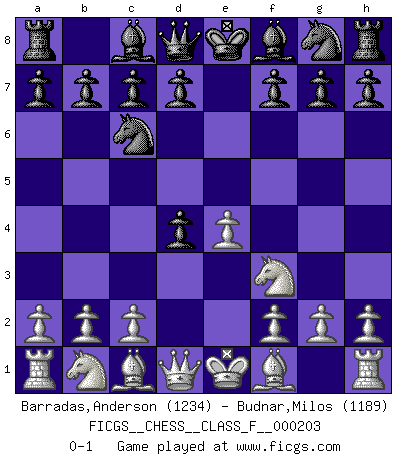 Last move : 0-1 2018 August 9 21:57:8 [Event "FICGS__CHESS__CLASS_F__000203"] [Site "FICGS"] [Date "2018.06.15"] [Round "1"] [White "Barradas,Anderson"] [Black "Budnar,Milos"] [Result "0-1"] [WhiteElo "1234"] [BlackElo "1189"] 1.e4 e5 2.Nf3 Nc6 3.d4 exd4 0-1 This chess game has been lost on time (started : 2018.06.15 22:36:20) Scotch Opening Player Black won this chess game. Follow this game move after move (download)Checkers is for tramps. (Paul Morphy) Weshalb minderdergeübte Spieler mit g2-g4 beginnen? Die betreffenden sind unschlüssig, ob sie nun rechts (h4) oder links (f4) beginnen sollen, und in ihrer Ratlosigkeit entschliessen sie sich nach guter Bürgerart dazu, den goldenen Mittelweg zu wählen. (Aaron Nimzowitsch) Del Ajedrez se ha dicho que la vida no es lo suficientemente larga para él, pero eso es culpa de la vida, no del Ajedrez. (William Ewart Napier) Un footballeur joue avec ses pieds, parfois avec sa tête. Un joueur d'échecs ne joue qu'avec sa tête. Et quand il ne joue plus, il meurt. (Jacob Murray) The ultimate in disposing one's troops is to be without ascertainable shape. Then the most penetrating spies cannot pry in nor can the wise lay plans against you. (Sun Tzu)