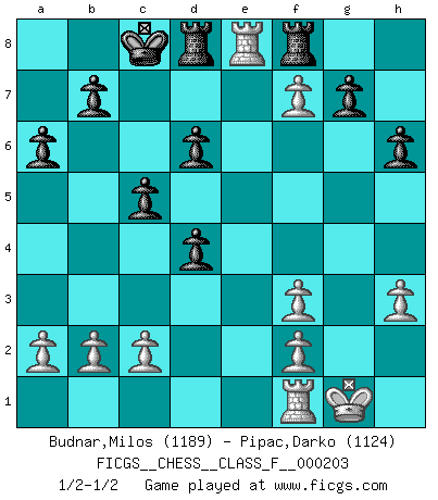 Last move : 1/2-1/2 2018 July 21 14:56:37 [Event "FICGS__CHESS__CLASS_F__000203"] [Site "FICGS"] [Date "2018.06.15"] [Round "1"] [White "Budnar,Milos"] [Black "Pipac,Darko"] [Result "1/2-1/2"] [WhiteElo "1189"] [BlackElo "1124"] 1.e4 e5 2.Nc3 Nf6 3.Nf3 Nc6 4.d4 exd4 5.Nd5 h6 6.Bb5 a6 7.Bxc6 dxc6 8.Nxf6 Qxf6 9.O-O Bg4 10.h3 Bxf3 11.Qxf3 Qxf3 12.gxf3 c5 13.Bf4 Bd6 14.e5 Be7 15.Rae1 O-O-O 16.e6 Bd6 17.Bxd6 cxd6 18.exf7 Rhf8 19.Re7 Rd7 20.Re8+ Rd8 21.Re7 Rd7 22.Re8+ Rd8 1/2-1/2 Vienna : Falkbeer variation Kingside Castling by player White (move 9) Queenside Castling by player Black (move 15) This chess game ended in a draw. Follow this game move after move (download)Many have become Chess Masters, no one has become the Master of Chess. (Siegbert Tarrasch) Rubinstein ist ein Turmendspiel, welches die Götter vor tausenden von Jahren begannen. (Savielly Grigorievitsch Tartakower) Sin errores no puede haber brillantez. (Emanuel Lasker) Il vaut toujours mieux jouer un plan faux de façon logique que de n'avoir pas de plan du tout. (Victor Kortchnoï) The absolute truth is the thing that makes people laugh. (Carl Reiner)