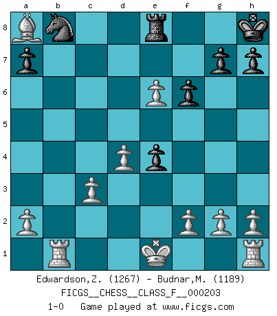 Last move : 1-0 2018 October 20 6:59:30 [Event "FICGS__CHESS__CLASS_F__000203"] [Site "FICGS"] [Date "2018.06.15"] [Round "1"] [White "Edwardson,Zachariah"] [Black "Budnar,Milos"] [Result "1-0"] [WhiteElo "1267"] [BlackElo "1189"] 1.d4 Nf6 2.Nf3 d5 3.Bf4 e6 4.e3 c5 5.c3 Bd6 6.Ne5 O-O 7.Nd2 c4 8.b3 b5 9.Be2 Ne4 10.Nxe4 dxe4 11.bxc4 bxc4 12.Qa4 f6 13.Nxc4 Bxf4 14.exf4 Ba6 15.Rb1 Bxc4 16.Bxc4 Qd6 17.f5 Kh8 18.fxe6 Qe7 19.Bd5 Qe8 20.Qxe8 Rxe8 21.Bxa8 1-0 Queen's pawn game Kingside Castling by player Black (move 6) Player White won this chess game. Follow this game move after move (download)An attack on the wing should be met by play in the center. (Nimzovitch) Vielleicht wirkt die Aura früherer Spieler glanzvoller als die der heutigen Spieler, aber das liegt daran, dass man kein Programm wie Fritz hatte, das einem all die Löcher in ihren Partien zeigt. (Vladimir Kramnik) Debió haber existido una vez en que los hombres eran semidióses, de otra manera no hubiesen podido inventar el Ajedrez. (Gustav Schenk) Les échecs sont plus proches de l'art de l'assassinat que de l'art de la guerre. (Arturo Perez-Reverte) The only difference between a tax man and a taxidermist is that the taxidermist leaves the skin. (Mark Twain)
