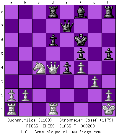 Last move : 1-0 2018 November 4 11:55:59 [Event "FICGS__CHESS__CLASS_F__000203"] [Site "FICGS"] [Date "2018.06.15"] [Round "1"] [White "Budnar,Milos"] [Black "Strohmeier,Josef"] [Result "1-0"] [WhiteElo "1189"] [BlackElo "1179"] 1.e4 c5 2.Nf3 Nc6 3.d4 cxd4 4.Nxd4 Nf6 5.Nc3 e6 6.Ndb5 d6 7.Bf4 e5 8.Bg5 a6 9.Bxf6 gxf6 10.Na3 b5 11.Nd5 f5 12.exf5 Bxf5 13.Bd3 Be6 14.c4 bxc4 15.Bxc4 h5 16.O-O f5 17.Nc7+ Qxc7 18.Bxe6 Nd4 19.Bd5 Rb8 20.Qa4+ Ke7 21.Nc4 Kf6 22.Qxa6 Ne2+ 23.Kh1 Nf4 24.Qc6 Qg7 25.g3 Nxd5 26.Qxd5 Qe7 27.Rfd1 Rd8 28.f4 e4 29.Qd4+ 1-0 Sicilian defense Kingside Castling by player White (move 16) Player White won this chess game. Follow this game move after move (download)All my games are real. (Bobby Fischer) Wenn ich Weiß habe gewinne ich weil ich Weiß habe, wenn ich Schwarz habe gewinne ich weil ich Bogoljubov bin. (Efim Bogoljubov) En el tablero, la mentira e hipocresía no sobreviven mucho. (Emanuel Lasker) A chaque perte on perd un peu de soi. (Joël Lautier) Optimism is a variety of information deficit. Sometimes especially true for correspondence chess games. (Michael Aigner)
