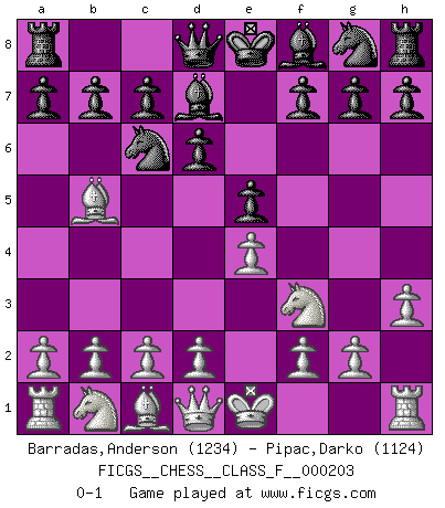 Last move : 0-1 2018 July 26 11:16:6 [Event "FICGS__CHESS__CLASS_F__000203"] [Site "FICGS"] [Date "2018.06.15"] [Round "1"] [White "Barradas,Anderson"] [Black "Pipac,Darko"] [Result "0-1"] [WhiteElo "1234"] [BlackElo "1124"] 1.e4 e5 2.Nf3 Nc6 3.Bb5 d6 4.h3 Bd7 0-1 This chess game has been lost on time (started : 2018.06.15 22:36:20) Ruy Lopez : Old Steinitz defense Player Black won this chess game. Follow this game move after move (download)My style is somewhere between that of Tal and Petrosian. (Reshevsky) Es ist besser die Steine des Gegners zu opfern. (Savielly Grigorievitsch Tartakower) El Ajedrez moderno está demasiado preocupado con cosas como la estructura de Peones. Olvidenlo, el Jaque Mate termina la partida. (Nigel Short) Shah mat. Le roi est mort. Cri de fierté d'un joueur venant de terrasser son adversaire, courtoisement, sans effusion de sang. A good book on your shelf is a friend that turns its back on you and remains a friend. (Author unknown)