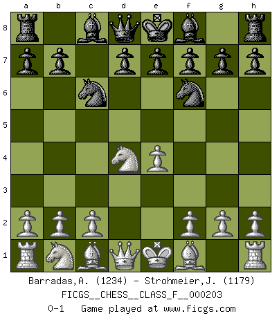 Last move : 0-1 2018 July 29 20:43:20 [Event "FICGS__CHESS__CLASS_F__000203"] [Site "FICGS"] [Date "2018.06.15"] [Round "1"] [White "Barradas,Anderson"] [Black "Strohmeier,Josef"] [Result "0-1"] [WhiteElo "1234"] [BlackElo "1179"] 1.e4 c5 2.Nf3 Nc6 3.d4 cxd4 4.Nxd4 Nf6 0-1 This chess game has been lost on time (started : 2018.06.15 22:36:20) Sicilian defense Player Black won this chess game. Follow this game move after move (download)Chess is imagination. (David Bronstein) Lisa Lane, amerikanische Schachmeisterin, hatte Fischer einmal als stärksten lebenden Spieler bezeichnet. Antwort: Das ist richtig, aber Lisa Lane ist eigentlich nicht in der Lage, das zu beurteilen. (Robert James Fischer) Repentinamente, me resultaba obvio en mi analisis que yo había pasado por alto lo que Fischer había visto en el tablero con la mas grande facilidad. (Mikhail Botvinnik) Aucun coup ne doit être joué sans but. (Pedro Damiano) Sometimes it pays to stay in bed in Monday, rather than spending the rest of the week debugging Monday's code. (Dan Salomon)