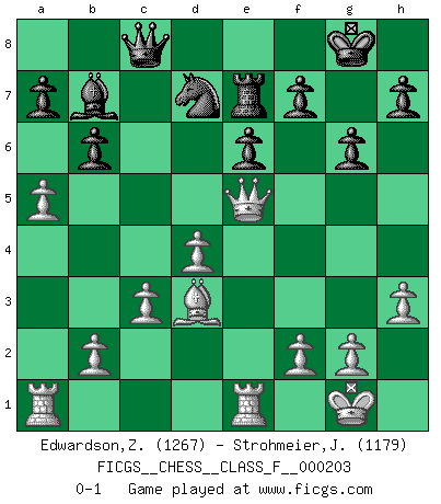 Last move : 0-1 2019 January 3 4:4:30 [Event "FICGS__CHESS__CLASS_F__000203"] [Site "FICGS"] [Date "2018.06.15"] [Round "1"] [White "Edwardson,Zachariah"] [Black "Strohmeier,Josef"] [Result "0-1"] [WhiteElo "1267"] [BlackElo "1179"] 1.d4 d5 2.Nf3 Nf6 3.Bf4 e6 4.e3 Be7 5.Bd3 O-O 6.h3 c5 7.c3 Nc6 8.O-O b6 9.Re1 Bb7 10.Nbd2 Rc8 11.Bc2 cxd4 12.exd4 Na5 13.Ne5 Nd7 14.Qg4 Nf6 15.Qe2 Nc4 16.Nexc4 dxc4 17.Nxc4 Ba6 18.Bd3 Nd5 19.Be5 Re8 20.a4 Bb7 21.a5 Bf6 22.Nd6 Re7 23.Qe4 g6 24.Nxc8 Qxc8 25.Bxf6 Nxf6 26.Qe5 Nd7 0-1 Queen's Bishop game Kingside Castling by player Black (move 5) Kingside Castling by player White (move 8) Player Black won this chess game. Follow this game move after move (download)Chess is ruthless: you've got to be prepared to kill people. (Nigel Short) Spiel ein langweiliges Spiel zu Ende und lustige Dinge können passieren. (Hans Ree) ¿Que sería del Ajedrez sin errores graciosos?. (Kurt Richter) Vous m'avez demandé de vous exposer quel est le fondement de la prière. Je ne fais que préparer les pièces du jeu sur la table... Nous sera-t-il permis d'en adopter les règles et si nous les appliquons scrupuleusement nous ne tarderons pas à faire mat le Roi divin ! Il ne pourra échapper à nos mains. (Sainte Thérèse d'Avila, Chemin de perfection) I would love to change the world, but they won't give me the source code. (Unknown)