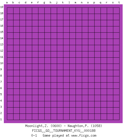 Last move : 0-1 2018 July 16 19:49:4 [Event "FICGS__GO__TOURNAMENT_KYU__000188"] [Site "FICGS"] [Date "2018.06.16"] [Round "1"] [Black "Moonlight,Zelda"] [White "Naughton,Patrick"] [Result "0-1"] [Rating 1 "0600"] [Rating 2 "1058"] 0-1 This go game has been lost on time (started : 2018.06.16 14:43:57) Here are the names of the openings (joseki) played in the four corners : Player White won this Go (weiqi, baduk) game. Follow this game move after move (download)Don't reduce your own liberties. (Bill Taylor) As a goal marker shodan is important. As a destination it is a poor place to stop. (Thomas Tamayo)