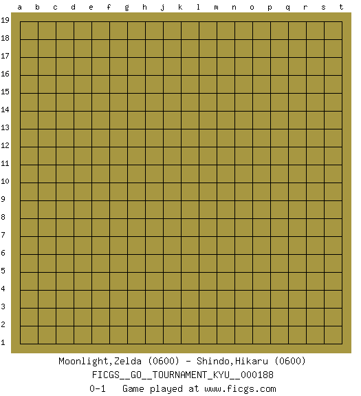 Last move : 0-1 2018 July 16 19:49:4 [Event "FICGS__GO__TOURNAMENT_KYU__000188"] [Site "FICGS"] [Date "2018.06.16"] [Round "1"] [Black "Moonlight,Zelda"] [White "Shindo,Hikaru"] [Result "0-1"] [Rating 1 "0600"] [Rating 2 "0600"] 0-1 This go game has been lost on time (started : 2018.06.16 14:43:57) Here are the names of the openings (joseki) played in the four corners : Player White won this Go (weiqi, baduk) game. Follow this game move after move (download)There is death in the hane. (Anonymous) War is the child of passion, passion is the child of narcissism and narcissism is the child. (...) Another game ? (Thibault de Vassal)