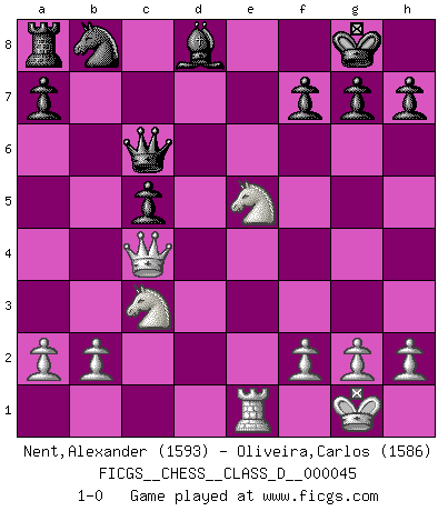 Last move : 1-0 2007 June 11 23:24:25 [Event "FICGS__CHESS__CLASS_D__000045"] [Site "FICGS"] [Date "2007.05.10"] [Round "1"] [White "Nent,Alexander"] [Black "Oliveira,Carlos"] [Result "1-0"] [WhiteElo "1593"] [BlackElo "1586"] 1.d4 d5 2.c4 dxc4 3.Nf3 c5 4.d5 e6 5.Nc3 Nf6 6.e4 b5 7.Nxb5 Qa5+ 8.Nc3 Nxe4 9.Bd2 Nxd2 10.Qxd2 Be7 11.Bxc4 O-O 12.O-O Rd8 13.Qe2 Qb6 14.Rad1 Ba6 15.dxe6 Bxc4 16.Qxc4 Qxe6 17.Rxd8+ Bxd8 18.Re1 Qc6 19.Ne5 1-0 QGA : 3.Nf3 Kingside Castling by player Black (move 11) Kingside Castling by player White (move 12) Player White won this chess game. Follow this game move after move (download)Chess is a terrific way for kids to build self image and self esteem. (Saudin Robovic) Wer mein Gambit spielt, muß bereit sein, alle Brücken hinter sich abzubrechen. Es verändert den ganzen Menschen. Es wirkt wie ein Zauberstab und fördert verkümmerte, gute Charakter- eigenschaften wieder zu Tage. (Emil Joseph Diemer) Cualquier cambio de material en una posición debe venir por medio de un mate, una captura o promoción de Peón. (Purdy) Les écrivains ont utilisé les échecs pour analyser les côtés extrêmes de la nature humaine. Dans ce cadre, les échecs offrent un champ d'expérimentation idéal. Mais on pourrait faire la même chose avec la peinture. Et là, en vous référant à Van Gogh, vous ne tirerez pas de conclusion définitive sur les peintres. (Gary Kasparov) Life is verb, not a noun. (Charlotte Perkins Gilman)
