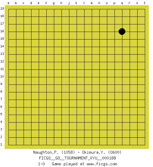 Last move : 1-0 2018 July 16 19:49:4 [Event "FICGS__GO__TOURNAMENT_KYU__000188"] [Site "FICGS"] [Date "2018.06.16"] [Round "1"] [Black "Naughton,Patrick"] [White "Okimura,Yoshiaki"] [Result "1-0"] [Rating 1 "1058"] [Rating 2 "0600"] 1.q16 1-0 This go game has been lost on time (started : 2018.06.16 14:43:57) Here are the names of the openings (joseki) played in the four corners : Player Black won this Go (weiqi, baduk) game. Follow this game move after move (download)Very few good moves are played. (Pierre Audouard) Whoever said the pen is mightier than the sword obviously never encountered automatic weapons. (US General Douglas MacArthur)