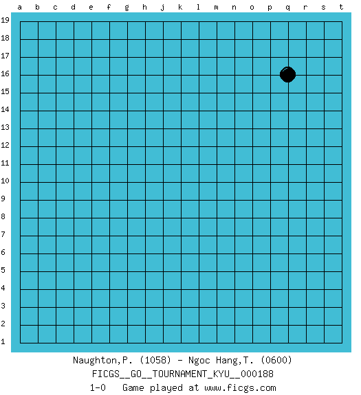 Last move : 1-0 2018 July 16 19:49:4 [Event "FICGS__GO__TOURNAMENT_KYU__000188"] [Site "FICGS"] [Date "2018.06.16"] [Round "1"] [Black "Naughton,Patrick"] [White "Ngoc Hang,Thai Thi"] [Result "1-0"] [Rating 1 "1058"] [Rating 2 "0600"] 1.q16 1-0 This go game has been lost on time (started : 2018.06.16 14:43:57) Here are the names of the openings (joseki) played in the four corners : Player Black won this Go (weiqi, baduk) game. Follow this game move after move (download)Don't overlook the edge of the board. (Anonymous) Inventor: A person who makes an ingenious arrangement of wheels, levers and springs, and believes it civilization. (Ambrose Bierce, The Devil's Dictionary)