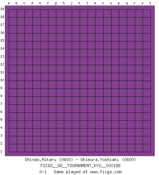 Last move : 0-1 2018 July 16 19:49:4 [Event "FICGS__GO__TOURNAMENT_KYU__000188"] [Site "FICGS"] [Date "2018.06.16"] [Round "1"] [Black "Shindo,Hikaru"] [White "Okimura,Yoshiaki"] [Result "0-1"] [Rating 1 "0600"] [Rating 2 "0600"] 0-1 This go game has been lost on time (started : 2018.06.16 14:43:57) Here are the names of the openings (joseki) played in the four corners : Player White won this Go (weiqi, baduk) game. Follow this game move after move (download)Territory is a closed space where time no longer exists. The transformation around it slower alter it, and sometimes it cracks open like a rotten egg at the least shock. (Pierre Audouard) If you don't practice you don't deserve to win. (Andre Agassi)