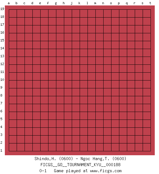 Last move : 0-1 2018 July 16 19:49:4 [Event "FICGS__GO__TOURNAMENT_KYU__000188"] [Site "FICGS"] [Date "2018.06.16"] [Round "1"] [Black "Shindo,Hikaru"] [White "Ngoc Hang,Thai Thi"] [Result "0-1"] [Rating 1 "0600"] [Rating 2 "0600"] 0-1 This go game has been lost on time (started : 2018.06.16 14:43:57) Here are the names of the openings (joseki) played in the four corners : Player White won this Go (weiqi, baduk) game. Follow this game move after move (download)Learn to play under the stones. (Anonymous) Nothing is more important for teaching us to understand the concepts we have than constructing fictitious ones. (Ludwig Wittgenstein)
