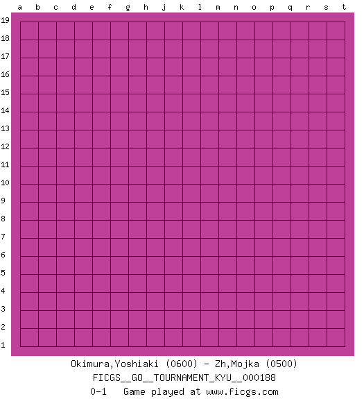 Last move : 0-1 2018 July 16 19:49:4 [Event "FICGS__GO__TOURNAMENT_KYU__000188"] [Site "FICGS"] [Date "2018.06.16"] [Round "1"] [Black "Okimura,Yoshiaki"] [White "Zh,Mojka"] [Result "0-1"] [Rating 1 "0600"] [Rating 2 "0500"] 0-1 This go game has been lost on time (started : 2018.06.16 14:43:57) Here are the names of the openings (joseki) played in the four corners : Player White won this Go (weiqi, baduk) game. Follow this game move after move (download)Balance is not what players strike for, and if it does arise, it is in spite of them. (Pierre Audouard) Mandala - that's it! 16x16 squares as multiple of the four and the eight because of the Four Noble Truths and the Noble Eightfold Path. (Heinz-Georg Lehnhoff about Big Chess)