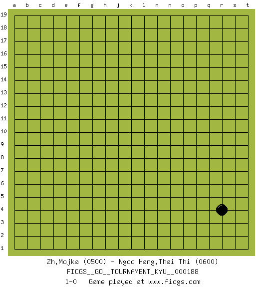 Last move : 1-0 2018 July 17 7:54:47 [Event "FICGS__GO__TOURNAMENT_KYU__000188"] [Site "FICGS"] [Date "2018.06.16"] [Round "1"] [Black "Zh,Mojka"] [White "Ngoc Hang,Thai Thi"] [Result "1-0"] [Rating 1 "0500"] [Rating 2 "0600"] 1.r4 1-0 This go game has been lost on time (started : 2018.06.16 14:43:57) Here are the names of the openings (joseki) played in the four corners : Corner q4 : r4 1-0 Komoku (Somok, Xiao~mu`) 3-4 Point. The komoku (3-4) point is the traditional corner enclosure move.. Player Black won this Go (weiqi, baduk) game. Follow this game move after move (download)On the third line, four die, six live. (Anonymous) The difference between stupidity and genius is that genius has its limits. (Murphy)