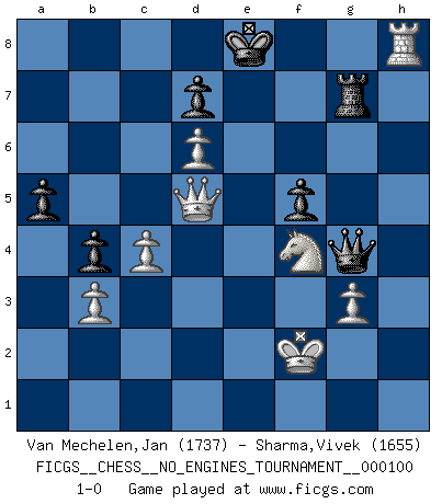 Last move : 1-0 2018 August 4 18:35:9 [Event "FICGS__CHESS__NO_ENGINES_TOURNAMENT__000100"] [Site "FICGS"] [Date "2018.06.17"] [Round "1"] [White "Van Mechelen,Jan"] [Black "Sharma,Vivek"] [Result "1-0"] [WhiteElo "1737"] [BlackElo "1655"] 1.c4 c5 2.g3 e5 3.Nc3 Nc6 4.Bg2 Nf6 5.Nf3 Bd6 6.O-O O-O 7.Ne1 b6 8.Nc2 Bb7 9.Ne3 Qe7 10.Ned5 Qe6 11.Nxf6+ Qxf6 12.Nd5 Qe6 13.d3 Ba6 14.e3 b5 15.b3 Rad8 16.Bb2 b4 17.a3 Bb7 18.axb4 cxb4 19.Qd2 Kh8 20.f4 f5 21.Kh1 h5 22.h4 g5 23.hxg5 Rf7 24.Kg1 Rg8 25.Kf2 Bc5 26.d4 exd4 27.exd4 Bf8 28.Nc7 Qg6 29.Rh1 R8g7 30.Bf3 Rh7 31.Rh4 Nd8 32.Rah1 Bxf3 33.Kxf3 Be7 34.Nd5 Bxg5 35.fxg5 Ne6 36.Nf4 Qxg5 37.d5 Ng7 38.Rxh5 Qg4+ 39.Kf2 Rxh5 40.Rxh5+ Kg8 41.Bxg7 Rxg7 42.Rh3 a5 43.d6 Kf7 44.Qd5+ Ke8 45.Rh8+ 1-0 English : Symmetrical variation Kingside Castling by player White (move 6) Kingside Castling by player Black (move 6) Player White won this chess game. Follow this game move after move (download)There are tough players and nice guys, and I'm a tough player. (Bobby Fischer) Gott hat gewollt, dass ich Champion werde. (Surab Azmajparaschvili) Los Peones son nacidos libres, y aún así, se encuentran encadenados por todos lados. (Rick Kennedy) A chaque perte on perd un peu de soi. (Joël Lautier) Methinks King Thibault should dub Marius Zubac a knight of the square board... I mean table, henceforth addressing him as Sir Marius, and bestow on him a suitable land from the kingdom of FICGS & marry him off to a worthy, fair maiden, lest he slice our heads with his mighty sword in his wrath. (Dinesh De Silva)