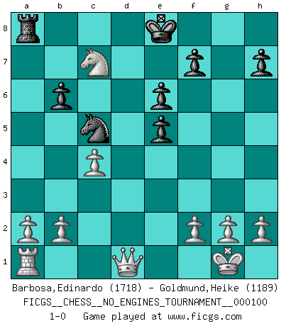 Last move : 1-0 2018 August 10 16:35:53 [Event "FICGS__CHESS__NO_ENGINES_TOURNAMENT__000100"] [Site "FICGS"] [Date "2018.06.17"] [Round "1"] [White "Barbosa,Edinardo"] [Black "Goldmund,Heike"] [Result "1-0"] [WhiteElo "1718"] [BlackElo "1189"] 1.d4 Nf6 2.c4 e6 3.Nc3 b6 4.e4 Bb7 5.Bd3 d6 6.Bg5 Be7 7.Nf3 c5 8.O-O cxd4 9.Nxd4 Nxe4 10.Bxe4 Bxg5 11.Bxb7 Nd7 12.Nc6 Qf6 13.Bxa8 Nc5 14.Qxd6 Bf4 15.Qd1 Bc7 16.Nxa7 Ke7 17.Re1 Rxa8 18.Nd5+ Ke8 19.Nxf6+ gxf6 20.Nb5 Be5 21.Rxe5 fxe5 22.Nc7+ 1-0 Queen's pawn game Kingside Castling by player White (move 8) Player White won this chess game. Follow this game move after move (download)In Chess, as it is played by masters, chance is practically eliminated. (Emanuel Lasker) In Buenos Aires ist es nicht mein vorrangiges Ziel ein starkes Turnier zu organisieren, sondern ein Turnier für Gentlemen. Ich würde nie Kamsky einladen. Ich mag keine Probleme. (Miguel Najdorf) Cada Peón es potencialmente una Reina. (James Mason) Le succès, c'est être capable d'aller d'échec en échec sans perdre son enthousiasme. (Winston Churchill) Wisdom begins at the end. (Daniel Webster)