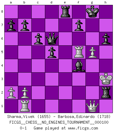Last move : 0-1 2018 July 26 3:53:2 [Event "FICGS__CHESS__NO_ENGINES_TOURNAMENT__000100"] [Site "FICGS"] [Date "2018.06.17"] [Round "1"] [White "Sharma,Vivek"] [Black "Barbosa,Edinardo"] [Result "0-1"] [WhiteElo "1655"] [BlackElo "1718"] 1.e4 e6 2.e5 d6 3.Nf3 Nc6 4.exd6 Bxd6 5.d4 Nf6 6.Bb5 Bd7 7.O-O O-O 8.c4 Na5 9.Nc3 c6 10.Ba4 Nxc4 11.Qd3 Nb6 12.Bg5 Nxa4 13.Nxa4 Be7 14.Nc5 Bc8 15.Rfe1 Bxc5 16.Bxf6 gxf6 17.Re4 f5 18.Rf4 Be7 19.d5 exd5 20.Nd4 Bf6 21.Nxf5 Bxf5 22.Rxf5 Bg7 23.Rh5 h6 24.g4 Qf6 25.Rb1 Qg6 26.Qd1 Rfe8 27.f3 Re3 28.Kg2 Rae8 29.Rf5 Re2+ 30.Kh3 Qd6 31.Qg1 Be5 32.f4 Bxf4 33.g5 Rxh2+ 0-1 French : Steinitz attack Kingside Castling by player White (move 7) Kingside Castling by player Black (move 7) Player Black won this chess game. Follow this game move after move (download)In order to improve your game, you must study the endgame before everything else, for whereas the endings can be studied and mastered by themselves, the middle game and the opening must be studied in relation to the endgame. (Jose Raul Capablanca) Ich hatte Angst gegen einen russischen Großmeister zu verlieren, und er befürchtete gegen einen kleinen Jungen zu verlieren. (über ein Remis gegen Juri Awerbach). (Robert James Fischer) Solo existe una cosa que Fischer hace en el Ajedrez sin placer: ¡perder!. (Boris Spassky) Horreur, mais aussi harmonie suprême : qu'y avait-il en effet au monde en dehors des échecs ? Le brouillard, l'inconnu, le non-être... (Vladimir Nabokov) Perception is reality. (Immanuel Kant)