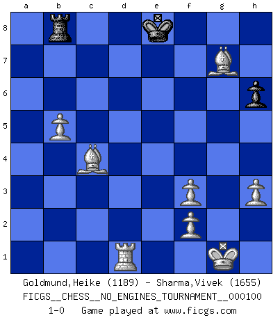 Last move : 1-0 2018 August 10 16:45:22 [Event "FICGS__CHESS__NO_ENGINES_TOURNAMENT__000100"] [Site "FICGS"] [Date "2018.06.17"] [Round "1"] [White "Goldmund,Heike"] [Black "Sharma,Vivek"] [Result "1-0"] [WhiteElo "1189"] [BlackElo "1655"] 1.b4 b5 2.Bb2 Bb7 3.e3 a6 4.Nf3 e6 5.c4 Nf6 6.c5 Nc6 7.Be2 Nxb4 8.a3 Nc6 9.Qc2 d6 10.cxd6 Bxd6 11.O-O O-O 12.Rd1 Ne5 13.Nxe5 c5 14.Nf3 Qe7 15.d3 Rad8 16.Nbd2 b4 17.axb4 Ng4 18.h3 Bh2+ 19.Nxh2 Nxh2 20.Kxh2 Qc7+ 21.Kg1 Rd5 22.Nf3 f5 23.Qc3 Rf6 24.e4 fxe4 25.dxe4 Rxd1+ 26.Rxd1 Bxe4 27.Ng5 Bd5 28.Bxa6 h6 29.Nf3 Bxf3 30.gxf3 e5 31.Qxe5 Qb6 32.Bc4+ Kf8 33.Qxc5+ Ke8 34.Qxb6 Rxb6 35.b5 Rb8 36.Bxg7 1-0 Polish (Sokolsky) opening Kingside Castling by player White (move 11) Kingside Castling by player Black (move 11) Player White won this chess game. Follow this game move after move (download)It is not a move, even the best move that you must seek, but a realizable plan. (Eugene Znosko-Borovsky) Ich bin stolz ein Bulgare zu sein. (Veselin Topalov) Todo se encuentra en un estado de flujo y esto incluye al mundo del Ajedrez. (Mikhail Botvinnik) Aidez vos pièces, elles vous aideront. (Paul Morphy) I've never seen so many men wasted so badly. (Blondie in The Good, The Bad and The Ugly)