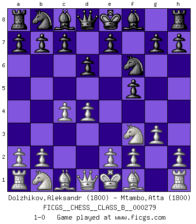 Last move : 1-0 2018 July 31 20:52:4 [Event "FICGS__CHESS__CLASS_B__000279"] [Site "FICGS"] [Date "2018.06.18"] [Round "1"] [White "Dolzhikov,Aleksandr"] [Black "Mtambo,Atta"] [Result "1-0"] [WhiteElo "1800"] [BlackElo "1800"] 1.c4 f5 2.d4 Nf6 3.Nf3 d6 4.g3 1-0 This chess game has been lost on time (started : 2018.06.18 22:4:11) English : Anglo-Dutch defense Player White won this chess game. Follow this game move after move (download)Chess is not like life... it has rules ! (Mark Pasternak) Man wirke der falschen Auffassung entgegen, als ob jeder Zug Unmittelbares zu leisten habe; auch Werte- und Ruhezüge haben ihre Existenzberechtigung. (Aaron Nimzowitsch) Hay dos clases de hombres: aquellos que se conforman en dejarse llevar por las circunstancias y que juegan barajas y aquellos decididos a controlar las circunstancias y que juegan al Ajedrez. (Mortimer Collins) Un footballeur joue avec ses pieds, parfois avec sa tête. Un joueur d'échecs ne joue qu'avec sa tête. Et quand il ne joue plus, il meurt. (Jacob Murray) I don't know, I don't care, and it doesn't make any difference. (Albert Einstein)
