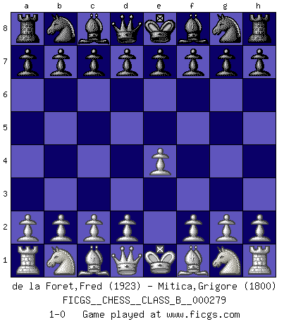 Last move : 1-0 2018 July 29 8:40:13 [Event "FICGS__CHESS__CLASS_B__000279"] [Site "FICGS"] [Date "2018.06.18"] [Round "1"] [White "de la Foret,Fred"] [Black "Mitica,Grigore"] [Result "1-0"] [WhiteElo "1923"] [BlackElo "1800"] 1.e4 1-0 This chess game has been lost on time (started : 2018.06.18 22:4:11) King's pawn Opening Player White won this chess game. Follow this game move after move (download)Chess is a more highly symbolic game, but the aggressions are therefore even more frankly represented in the play. It probably began as a war game; that is, the representation of a miniature battle between the forces of two kingdoms. (Karl Meninger) Kostenjuk hat keinen Sexappeal. (Loek van Wely) Hasta este punto, las blancas han seguido un análisis bien conocido. Pero ahora el hace un error fatal: empieza a usar su propia cabeza. (Siegbert Tarrasch) Les échecs sont plus proches de l'art de l'assassinat que de l'art de la guerre. (Arturo Perez-Reverte) When you've done things right people won't know you've done anything at all. (Futurama)