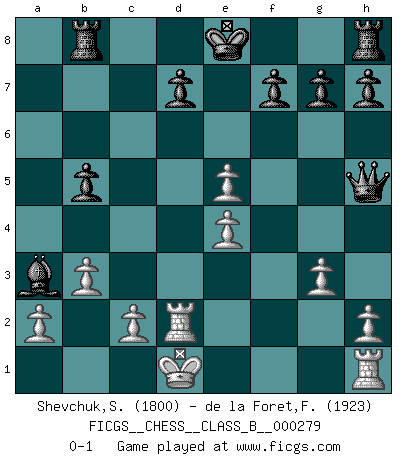 Last move : 0-1 2019 January 9 4:32:0 [Event "FICGS__CHESS__CLASS_B__000279"] [Site "FICGS"] [Date "2018.06.18"] [Round "1"] [White "Shevchuk,Sergey"] [Black "de la Foret,Fred"] [Result "0-1"] [WhiteElo "1800"] [BlackElo "1923"] 1.e4 c5 2.d4 cxd4 3.Qxd4 Nc6 4.Qa4 Nf6 5.Nc3 e6 6.Nb5 a6 7.Bf4 e5 8.Bg5 Rb8 9.Nf3 axb5 10.Bxb5 Qb6 11.O-O-O Bc5 12.Bxc6 bxc6 13.b3 Ng4 14.Bh4 Ba6 15.Nxe5 Nxe5 16.f4 Bb5 17.Qxb5 cxb5 18.fxe5 Qh6+ 19.Rd2 Ba3+ 20.Kd1 Qxh4 21.g3 Qh5+ 0-1 Sicilian : Smith-Morra gambit Queenside Castling by player White (move 11) Player Black won this chess game. Follow this game move after move (download)Spassky will not be psyched out by Fischer. (Mike Goodall) Darum geht es im Schach. Einen Tag gibst du deinem Gegner eine Lektion, am nächsten Tag gibt er dir eine. (Robert James Fischer) Un Peón pasado es un criminal, quién debe ser mantenido bajo candado y llave. Leves medidas, tales como vigilancia policiaca, no son suficientes. (Aaron Nimzovich) Nous sommes les pions de la mystérieuse partie d'Echecs jouée par Dieu. Il nous déplace, nous arrête, nous pousse encore, puis nous lance un à un dans la boîte du Néant. Epitaphe sur la tombe de David Janowsky (1868-1927). A computer lets you make more mistakes faster than any invention in human history - with the possible exceptions of handguns and tequila. (Mitch Ratcliffe)