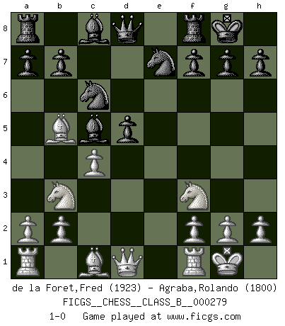 Last move : 1-0 2018 September 4 11:45:12 [Event "FICGS__CHESS__CLASS_B__000279"] [Site "FICGS"] [Date "2018.06.18"] [Round "1"] [White "de la Foret,Fred"] [Black "Agraba,Rolando"] [Result "1-0"] [WhiteElo "1923"] [BlackElo "1800"] 1.e4 e6 2.d4 d5 3.Nd2 c5 4.Ngf3 Nc6 5.exd5 exd5 6.Bb5 Bd6 7.O-O Nge7 8.dxc5 Bxc5 9.c4 O-O 10.Nb3 1-0 This chess game has been lost on time (started : 2018.06.18 22:4:11) French : Tarrasch, Open variation Kingside Castling by player White (move 7) Kingside Castling by player Black (move 9) Player White won this chess game. Follow this game move after move (download)Fischer was a master of clarity and a king of artful positioning. His opponents would see where he was going but were powerless to stop him. (Bruce Pandolfini) Ein Buch ist ein Spiegel; wenn ein Affe hineinsieht, so kann kein Apostel heraus gucken. (Georg Christoph Lichtenberg) La esencia del Ajedrez es pensar acerca de lo que el Ajedrez es. (David Bronstein) Les échecs sont un jeu terrible. Si vous n'avez pas le centre, votre adversaire a une position plus libre. Par contre, si vous avez le centre, alors vous avez vraiment quelque chose pour laquelle vous inquiéter ! (Siegbert Tarrasch) He who fights with monsters should be careful lest he thereby become a monster. (Friedrich Nietzsche, Beyond Good and Evil)