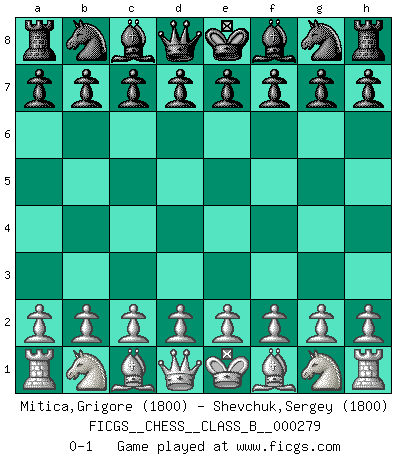 Last move : 0-1 2018 July 29 8:40:13 [Event "FICGS__CHESS__CLASS_B__000279"] [Site "FICGS"] [Date "2018.06.18"] [Round "1"] [White "Mitica,Grigore"] [Black "Shevchuk,Sergey"] [Result "0-1"] [WhiteElo "1800"] [BlackElo "1800"] 0-1 This chess game has been lost on time (started : 2018.06.18 22:4:11) Player Black won this chess game. Follow this game move after move (download)When you absolutely don't know what to do anymore, it is time to panic. (John van der Wiel) Das Schach hält seine Meister in eigenen Banden, Fesseln; auf vielerlei Weise formt es ihren Geist, so dass die innere Freiheit selbst des Stärksten beeinflusst wird. (Albert Einstein) El Ajedrez, como cualquier otra actividad creativa, puede existir solo a través de méritos combinados de aquellos que tienen talento creativo y de aquellos que tienen la habilidad de organizar un trabajo creativo. (Mikhail Botvinnik) Le plus grand jeu de l'esprit jamais inventé, plus vous l'apprenez, plus vous y prenez du plaisir. (Garry Kasparov) They say poker is a zero-sum game. It must be, because every time I play my sum ends up zero. (Max Shapiro)