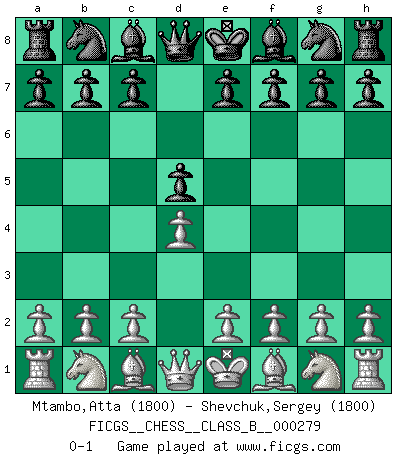 Last move : 0-1 2018 July 29 8:40:13 [Event "FICGS__CHESS__CLASS_B__000279"] [Site "FICGS"] [Date "2018.06.18"] [Round "1"] [White "Mtambo,Atta"] [Black "Shevchuk,Sergey"] [Result "0-1"] [WhiteElo "1800"] [BlackElo "1800"] 1.d4 d5 0-1 This chess game has been lost on time (started : 2018.06.18 22:4:11) Queen's pawn game Player Black won this chess game. Follow this game move after move (download)Chess is no whit inferior to the violin, and we have a large number of professional violinists. (Mikhail Botvinnik) Wenn Du einsam bist, wenn Du Dich in der Welt wie ein Fremder fühlst, spiele Schach. Das wird Deinen Geist erheben und Dein Ratgeber im Kampf sein. (Aristoteles) Hoy en día, si tu no eres un Gran Maestro a los 14 años, es mejor que lo olvides. (Anand Viswanathan) Votre seul travail dans les ouvertures est d'obtenir un milieu de partie jouable. (Lajos Portish) The mind is like a parachute, it only functions when its open. (Unknown)